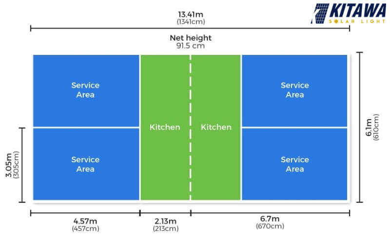 Sai lầm tiếp theo trong cách chọn đèn sân Pickleball là kích thước sân. Sân Pickleball có kích thước chuẩn là 13,4 m x 6,1 m, sân pickleball rộng tương đương sân cầu lông và chỉ bằng một phần tư sân tennis. Một sân pickleball chuẩn cần có không gian an toàn xung quanh ít nhất 1,5 m, để đảm bảo an toàn cho người chơi với tổng diện tích sử dụng khoảng 9,1 m x 18,3 m.