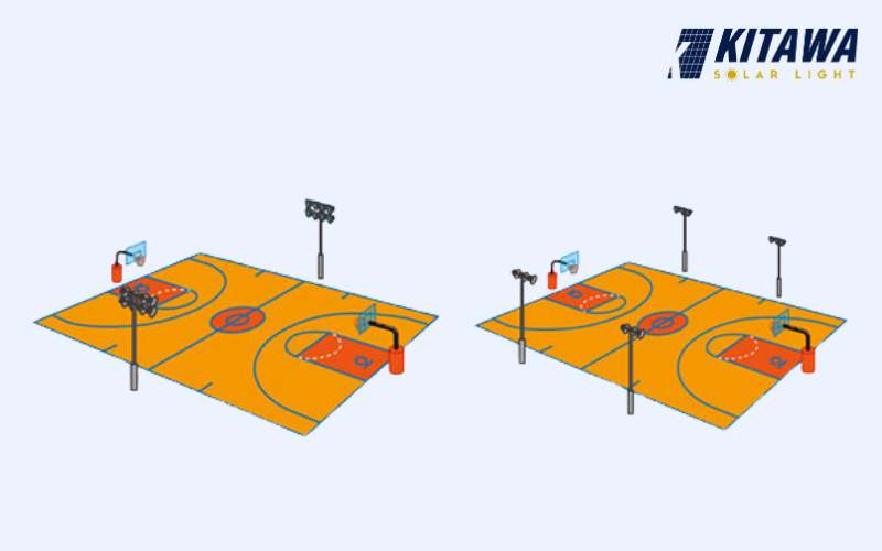Sân bóng rổ có diện tích chiếu sáng tương đối nhỏ, do đó, việc đặt cột đèn dọc hai bên đường biên sẽ hiệu quả hơn so với việc đặt ở phía sau sân. Vị trí cột đèn cần được lựa chọn sao cho ánh sáng chiếu xuống giảm thiểu tối đa hiện tượng chói mắt.