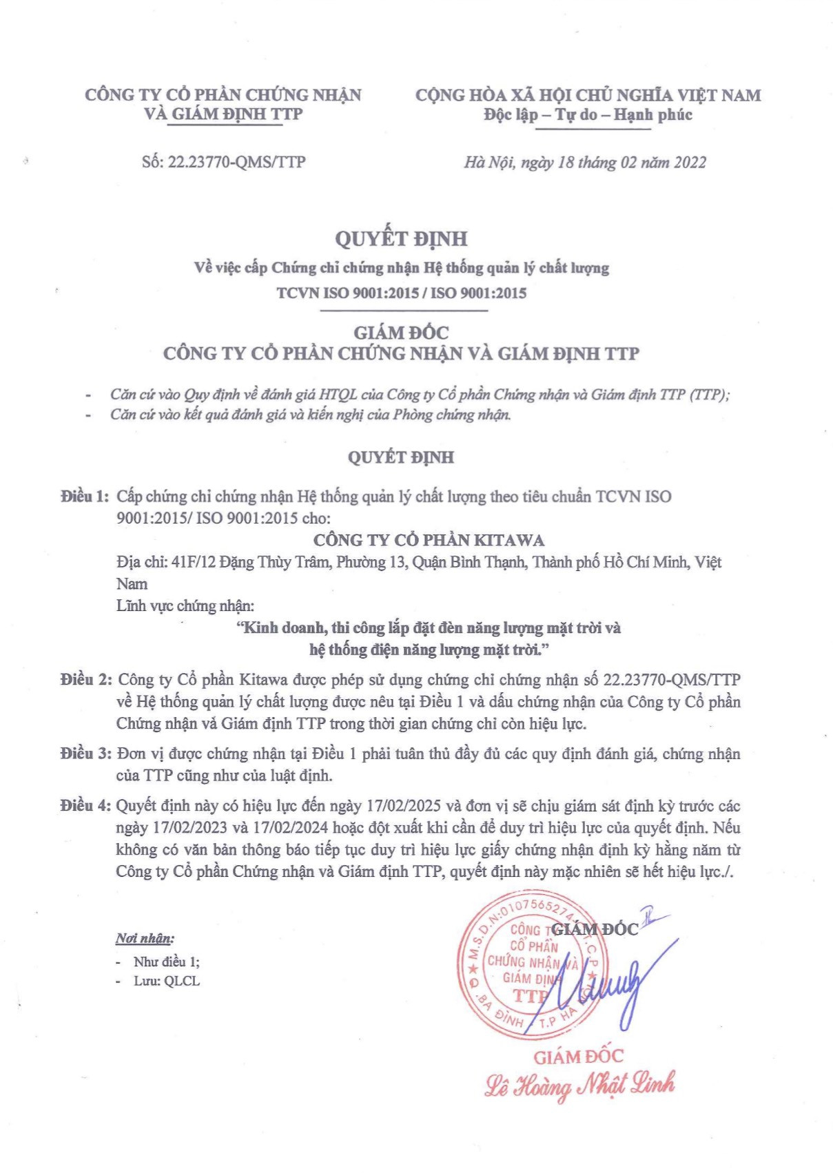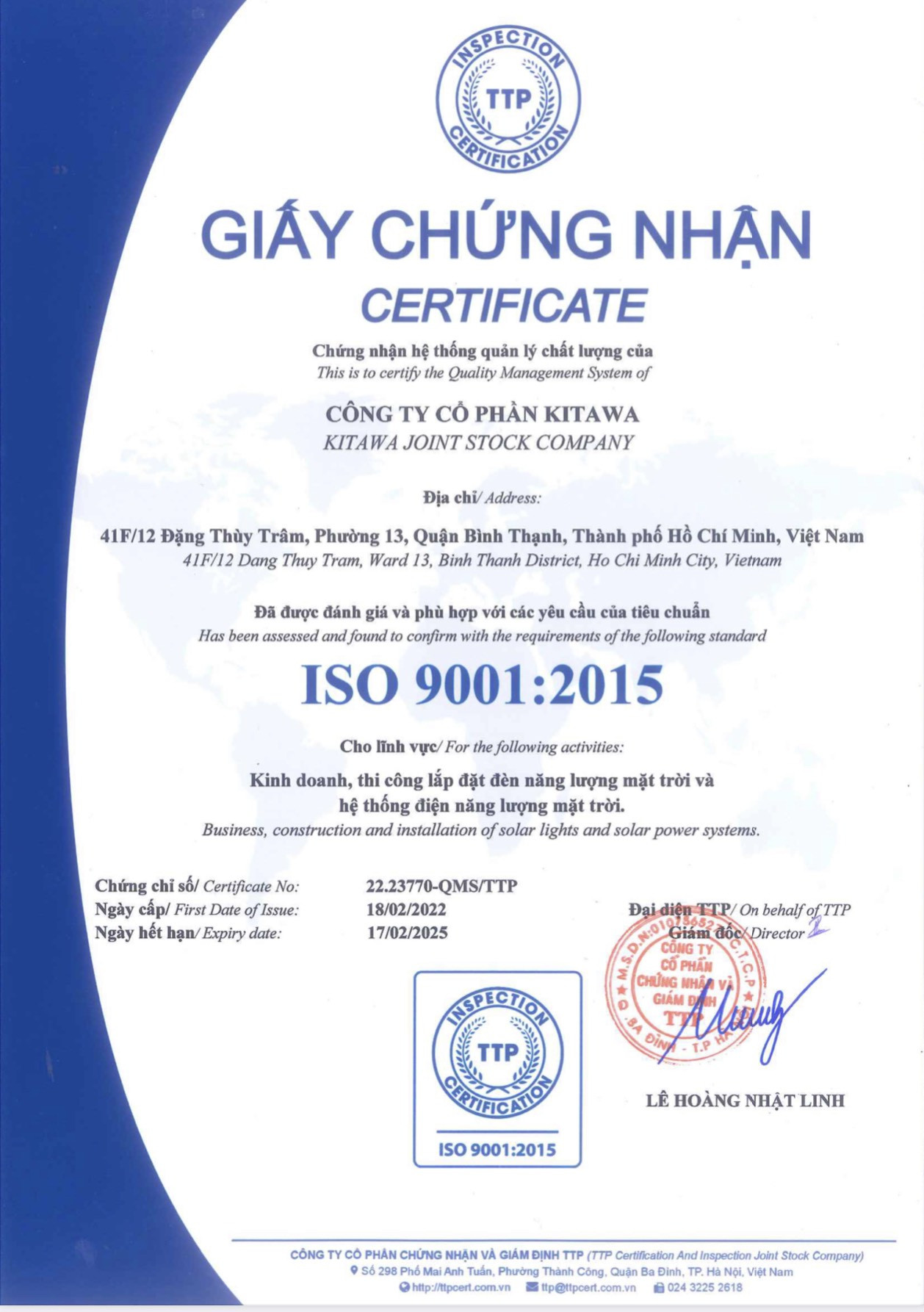 Sau hơn 2 tháng nỗ lực thực hiện cộng với sự hỗ trợ của Công ty Cổ phần Chứng Nhận và Giám Định TTP, ngày 18 tháng 02 năm 2022 Công ty Cổ phần KITAWA đạt chứng nhận ISO 9001:2015 9001 phiên bản 2015.
