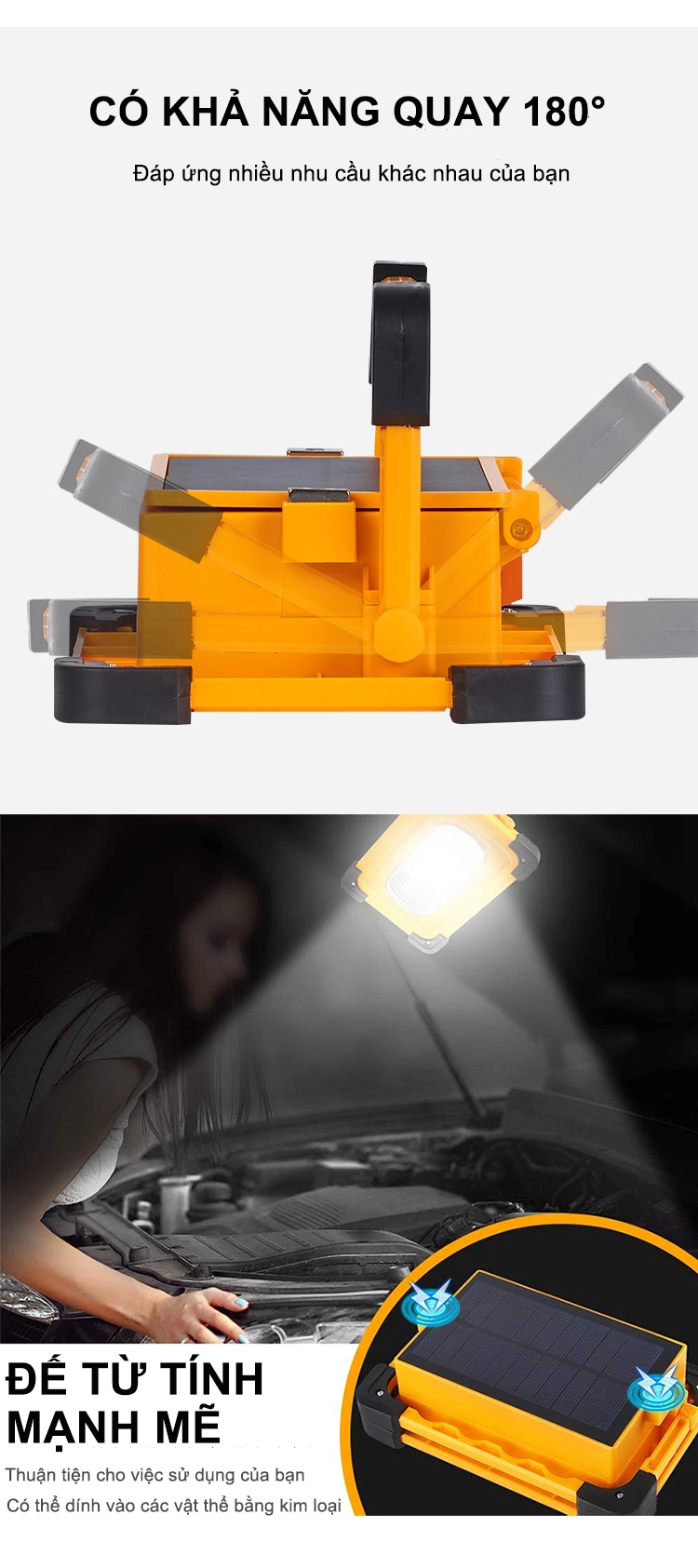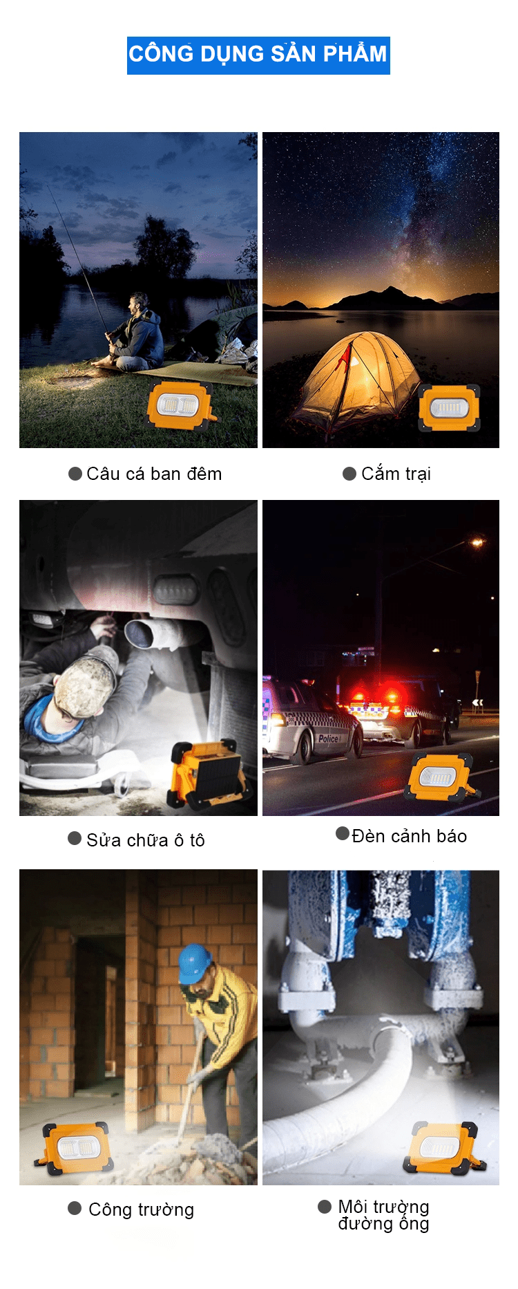 Đèn chiếu sáng thích hợp cho công việc ngoài trời, cắm trại, nướng thịt, bảo dưỡng xe, câu cá ban đêm, chống nước tốt IP65 siêu tốt, chất liệu ABS cao cấp. Độ bền sản phẩm lên đến hơn 10 năm.