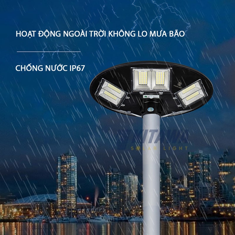 Đèn năng lượng hình đĩa bay UFO 500W được trang bị chuẩn IP67 có khả năng chống bụi và chống nước vượt trội để bạn yên tâm lắp đặt ngoài trời và sử dụng trong mọi điều kiện thời tiết.