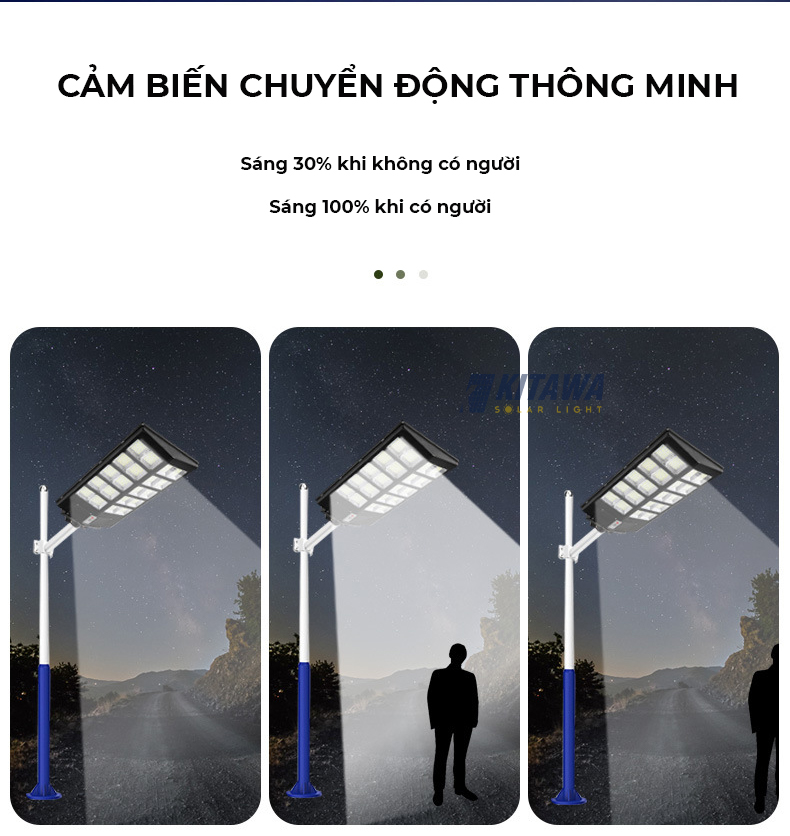 - Đèn liền thể năng lượng mặt trời trang bị cảm biến chuyển động thông minh, sẽ bật sáng 100% khi nhận biết sự chuyển động.