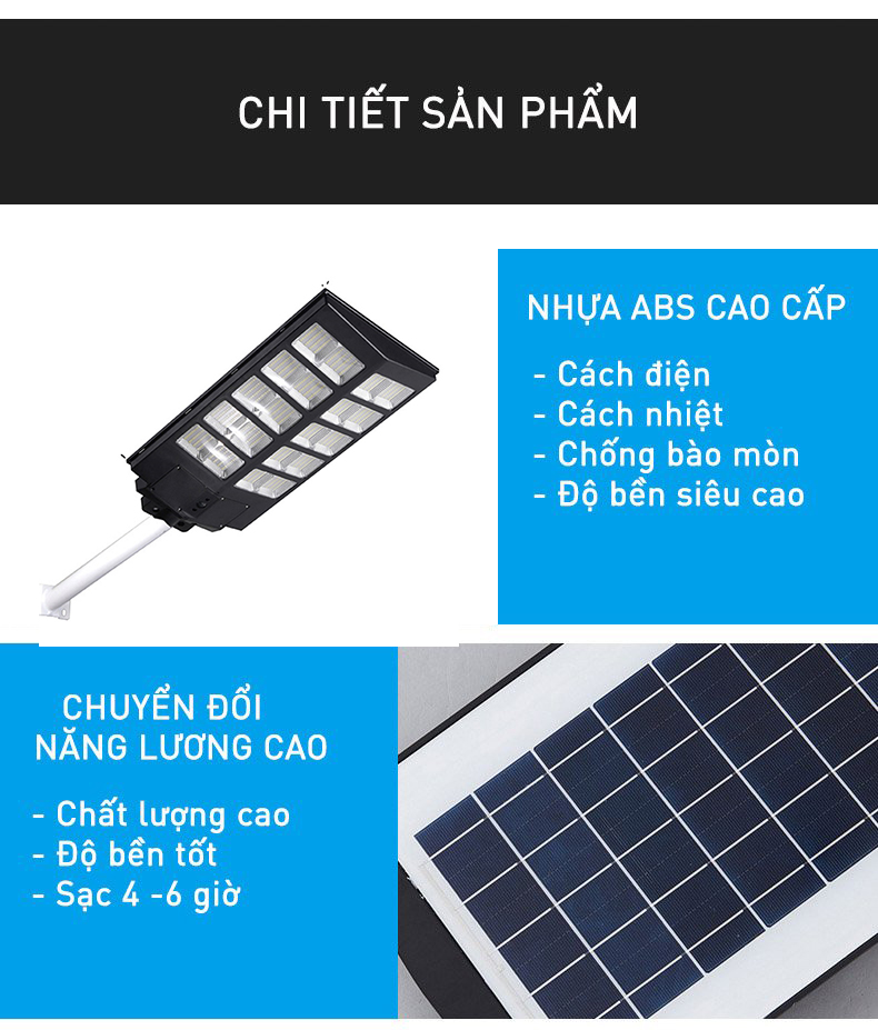 Tấm pin năng lượng mặt trời chất lượng cao và có diện tích lớn, hiệu suất chuyển đổi năng lượng cao, đèn tích trữ năng lượng nhanh cho quá trình hoạt động tốt nhất. Ngoài ra, tấm pin còn được điều chỉnh theo hướng nhận ánh sáng tốt nhất.