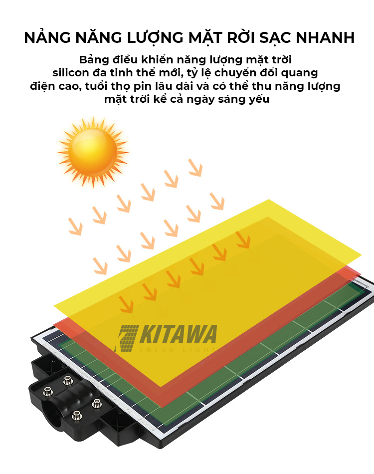 Tấm pin đa tinh thể Polysilicon giúp đèn sạc nhanh chóng. Pin có thể được sạc đầy chỉ từ 4-6 giờ nắng tiêu chuẩn.