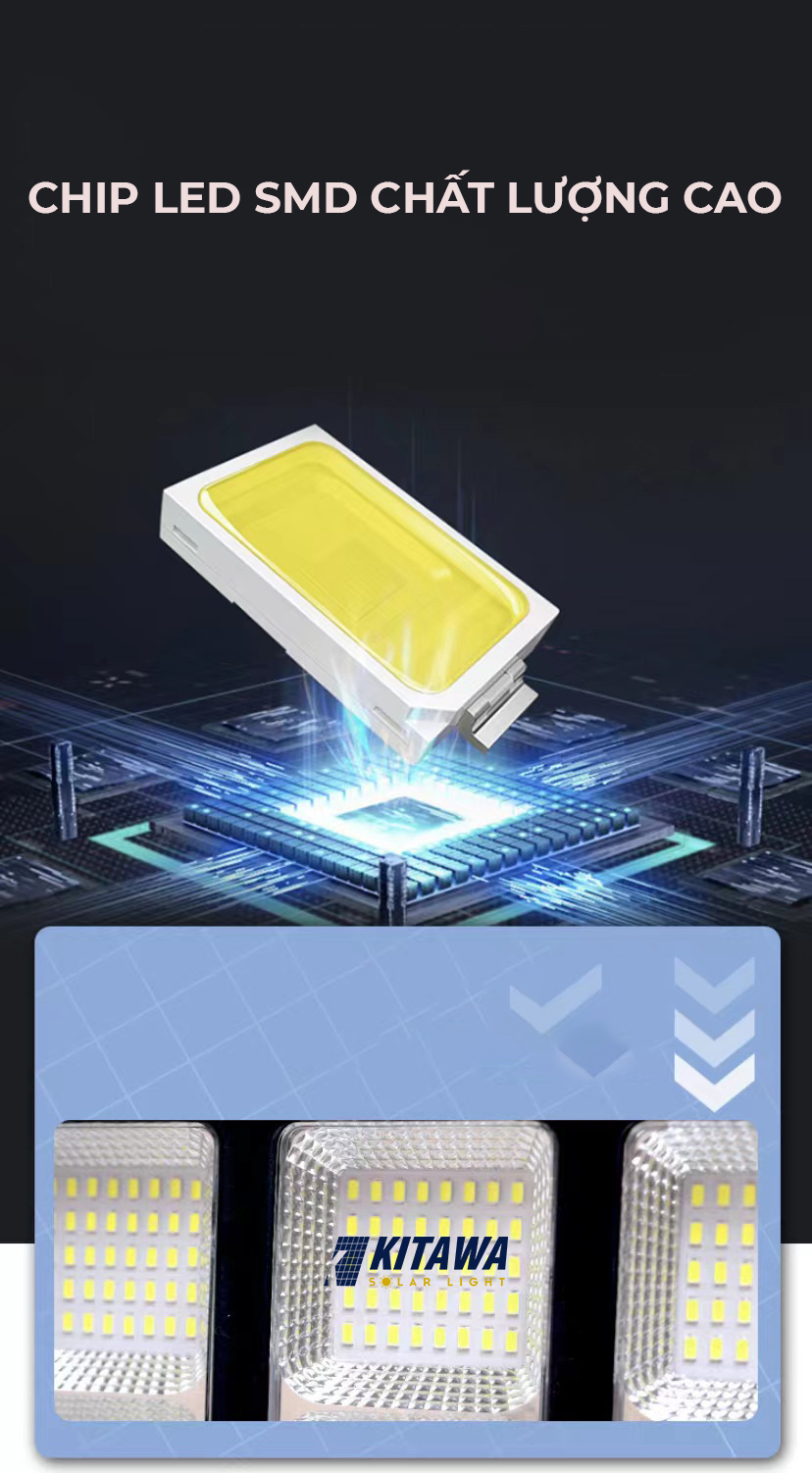 Đèn liền thể năng lượng mặt trời 2 cánh 500W cũng được trang bị Chip Led chất lượng với 800 chip giúp tuổi thọ cao hơn so với các loại Led thông thường khác và giữ được mức độ đều màu cao hơn. Tuổi thọ LED là hơn 50.000 giờ (tương đương 12 năm sử dụng). Ngoài ra đèn thiết kế mỗi chíp Led sẽ có một thấu kính khuếch đại gắng kèm giúp phân bố ánh sáng được đồng đều hơn.