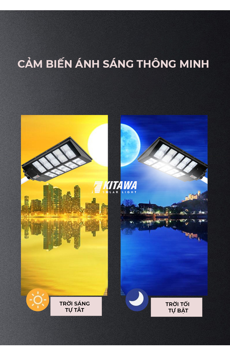 - Nhờ chip cảm biến thông minh, đèn có thể tự động bật/tắt khi trời tối/sáng.