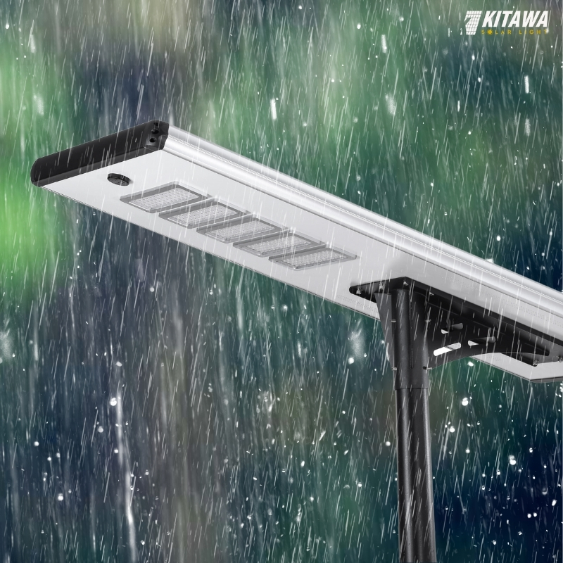 Với tiêu chuẩn chống bụi chống nước IP66, đèn năng lượng mặt trời tại KITAWA có khả năng hoạt động ổn định trong nhiều điều kiện thời tiết khắc nghiệt. Toàn bộ thân đèn được thiết kế kín hoàn toàn, chống xâm nhập bụi bẩn và chịu được tia nước áp lực cao từ mọi hướng, giúp bảo vệ linh kiện bên trong khỏi ẩm mốc, rỉ sét hay hư hỏng. Nhờ đó, đèn duy trì hiệu suất chiếu sáng bền bỉ, phù hợp sử dụng ngoài trời trong thời gian dài mà không lo ảnh hưởng bởi mưa gió hay môi trường khắc nghiệt.