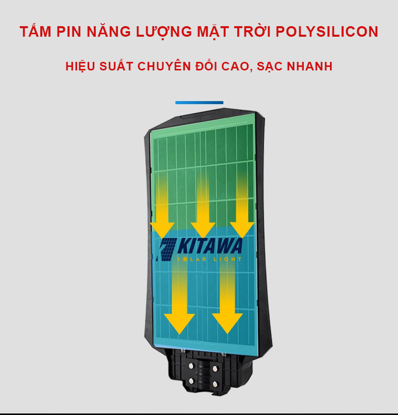 - Tấm pin đa tinh thể Polysilicon giúp đèn sạc nhanh chóng. Pin có thể được sạc đầy chỉ từ 4-6 giờ nắng tiêu chuẩn.