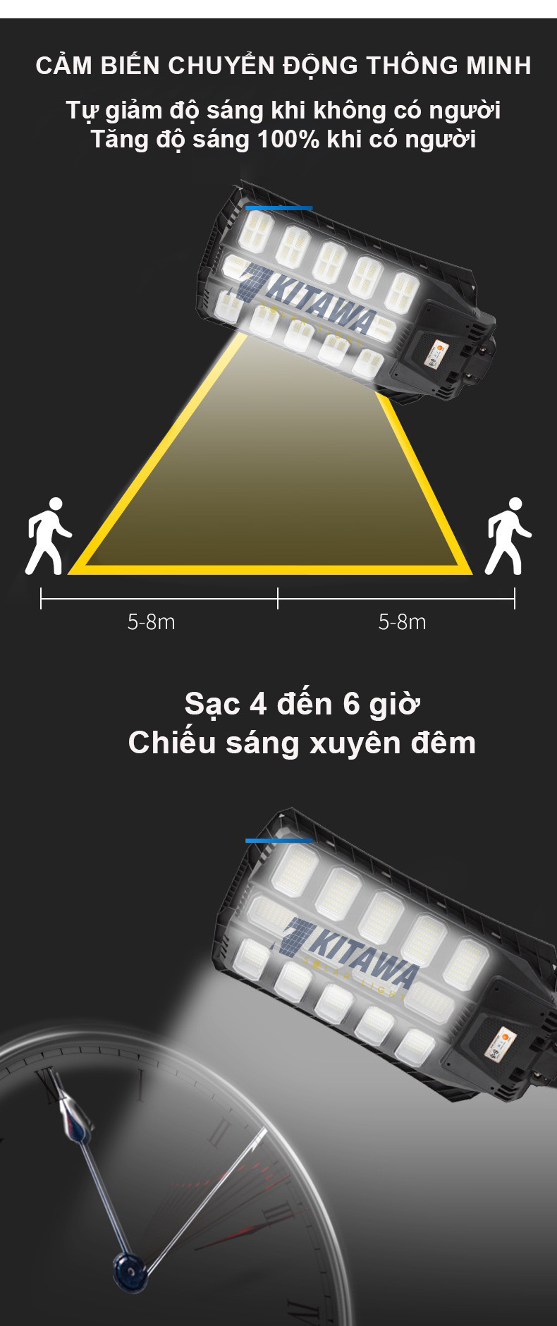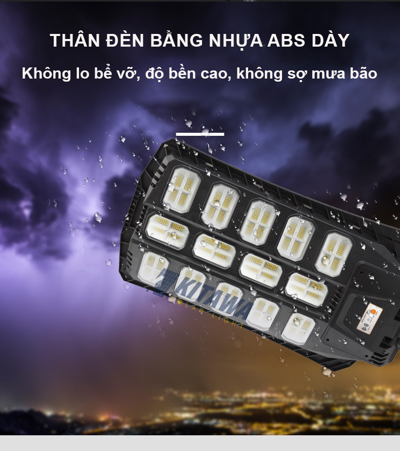 Đèn liền thể năng lượng mặt trời 650W KITAWA được trang bị chuẩn IP65 có khả năng chống bụi và chống nước vượt trội để bạn yên tâm lắp đặt ngoài trời và sử dụng trong mọi điều kiện thời tiết