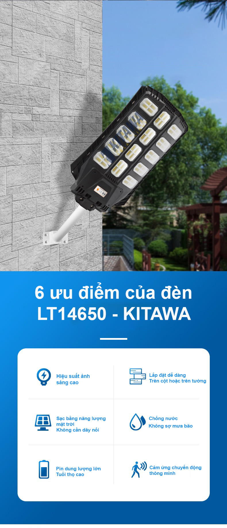 Đèn liền thể năng lượng mặt trời KITAWA LT14650 là một trong những mẫu đèn năng lượng mặt trời có công suất lớn 650W nên không chỉ gia đình mà các chủ đầu xây dựng, chủ quản dự án có thể lựa chọn để lắp đặt cho công trình của mình. Đèn năng lượng mặt trời 650W KITAWA LT14650 là mẫu đèn được thiết kế bao gồm Tấm năng lượng liền thể với đèn năng lượng mặt trời và các linh kiện khác đi kèm, cực kỳ dễ dàng cho việc vận chuyển và lắp đặt.
