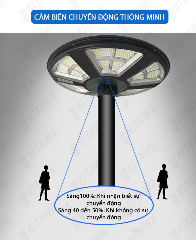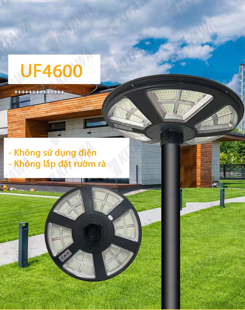 Đèn năng lượng mặt trời KITAWA hình đĩa bay UFO UF4600 là một trong những mẫu đèn năng lượng mặt trời có công suất lớn 600W nên không chỉ gia đình mà các chủ đầu xây dựng, chủ quản dự án có thể lựa chọn để lắp đặt cho công trình của mình. Đèn năng lượng mặt trời hình đĩa bay UFO 600W là mẫu đèn được thiết kế bao gồm Tấm năng lượng liền thể với đèn năng lượng mặt trời và các linh kiện khác đi kèm, cực kỳ dễ dàng cho việc vận chuyển và lắp đặt.