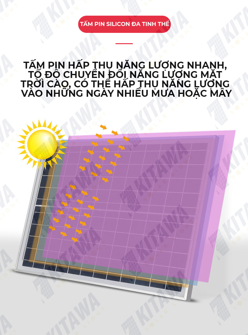 Tấm pin đa tinh thể Polysilicon giúp đèn sạc nhanh chóng. Pin có thể được sạc đầy chỉ từ 4-6 giờ nắng tiêu chuẩn.