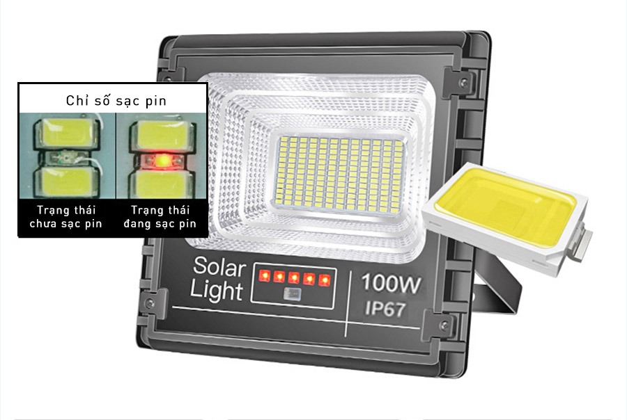 - Cả đèn pha năng lượng mặt trời 100W và tấm thu đều được trang bị khả năng chống nước tiêu chuẩn IP67. Đồng nghĩa với việc chống bụi hoàn toàn và chống được nước tạt vào từ nhiều phía.