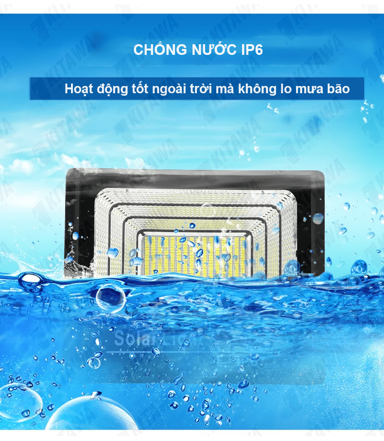 Đèn Pha Năng Lượng Mặt Trời Chống Chói 100W KITAWA được trang bị chuẩn IP66 có khả năng chống bụi và chống nước vượt trội để bạn yên tâm lắp đặt ngoài trời và sử dụng trong mọi điều kiện thời tiết