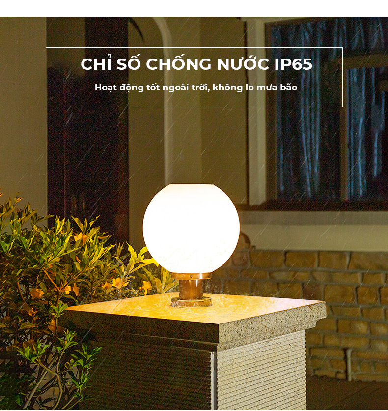 Đèn trụ cổng này sở hữu chỉ số chống nước IP65: Ngăn chặn sự xâm nhập của các đối tượng và bụi hoàn toàn và ngăn chặn sự xâm nhập của nước vòi phun áp lực lớn ở tất cả các hướng. Do đó đèn không những có thể sử dụng trong nhà mà còn có thể treo ngoài trời dù mưa bão vẫn không gây ảnh hưởng gì tới đèn.