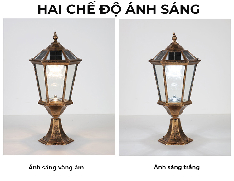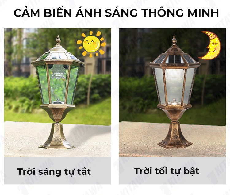 - Không tốn thêm chi phí tiền điện, đèn cổng trụ tự tiếp nhận điện năng bằng pin năng lựơng mặt trời, có mắt cảm ứng tự động chiếu sáng khi trời tối.