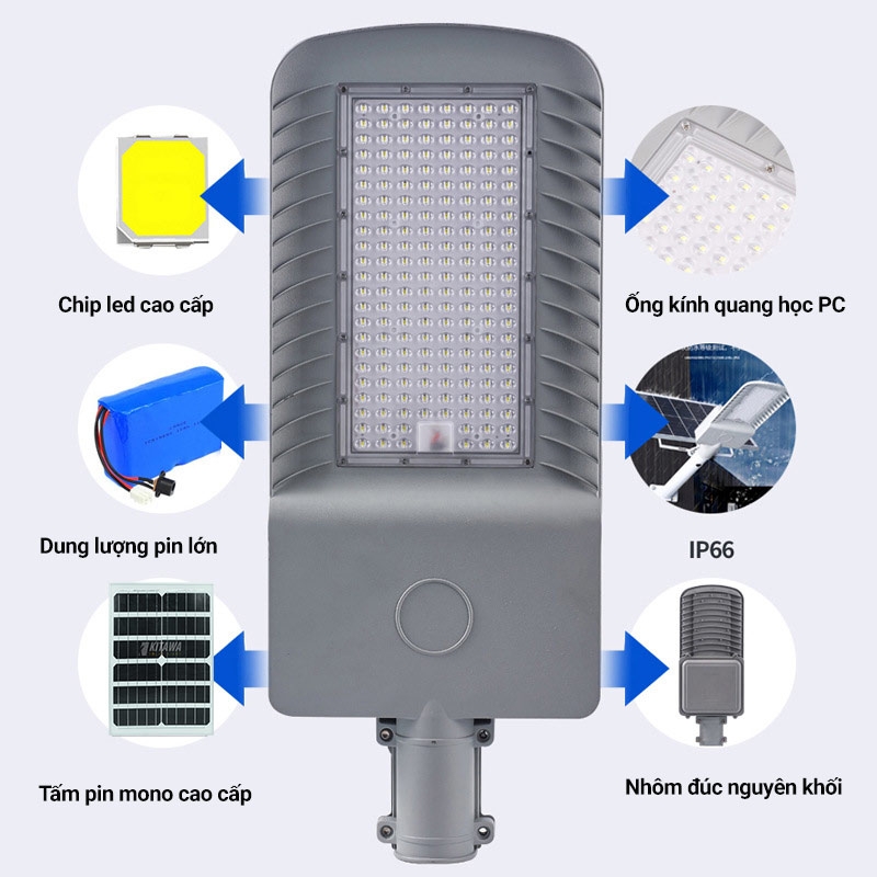 - Nguyên liệu của đèn: Nên chọn các loại đèn làm từ nhôm đúc nguyên khối giúp cho đèn năng lượng mặt trời có khả năng chống chịu tốt mưa, bụi bẩn và các tác động từ tiêu cực từ thời tiết, giúp kéo dài tuổi thọ cho đèn hơn.