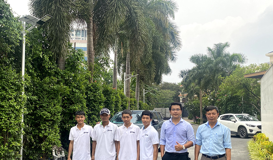 Các kĩ sư lắp đặt đèn năng lượng mặt trời cho hộ gia đình ở quận 2