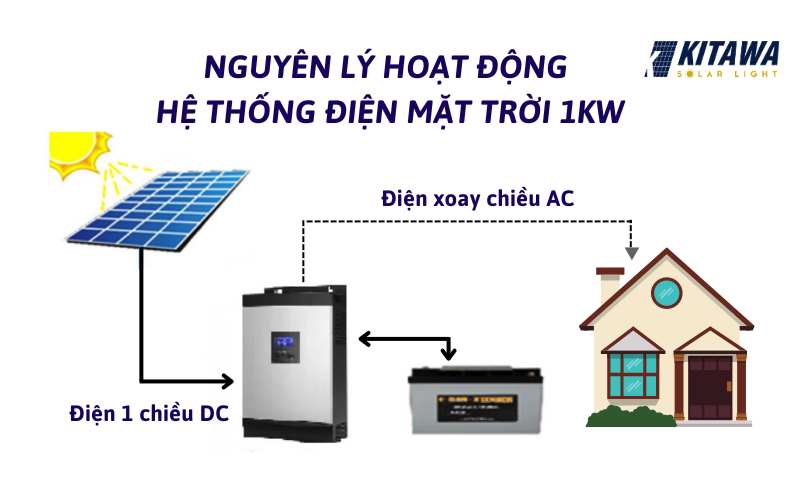 Hệ thống điện mặt trời 1kW hoạt động theo một quy trình khép kín, độc lập, để cung cấp nguồn điện ổn định. Dòng điện một chiều (DC) sẽ được tạo ra khi ánh sáng mặt trời chiếu vào các tấm pin. Sau đó, dòng điện được inverter chuyển đổi thành dòng điện xoay chiều (AC), sẵn sàng để các thiết bị điện tiêu thụ. Ắc quy sẽ lưu trữ các năng lượng dư thừa không được tiêu thụ. Và ắc quy sẽ được bộ điều khiển sạc giám sát quá trình sạc và xả, đảm bảo hệ thống hoạt động hiệu quả và bảo vệ các thành phần khỏi nguy cơ hư hỏng.
