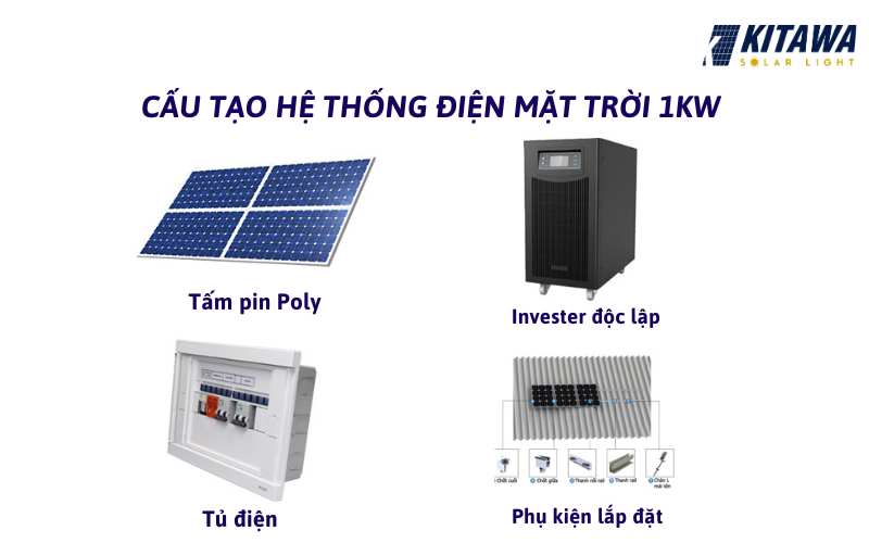 Một số phụ kiện khác: Ngoài các thành phần chính trên, hệ thống điện mặt trời 1kW còn bao gồm các phụ kiện khác như: Giá đỡ, dây dẫn, bộ giám sát.