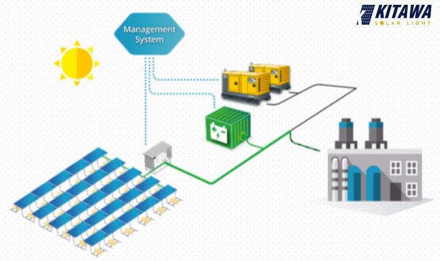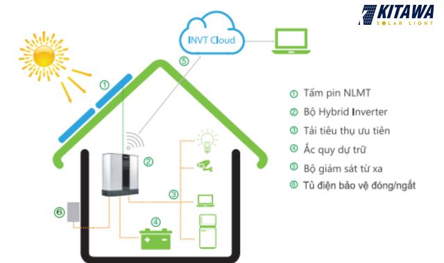 Khi tấm pin mặt trời tạo ra dòng điện một chiều, thì dòng điện này sẽ chuyển trực tiếp đến biến tần inverter độc lập và sẽ chuyển sang dòng điện xoay chiều có dạng chuẩn như điện lưới quốc gia. Sau đó điện sẽ được đưa đến để sạc đầy hệ thống acquy lưu trữ rồi cung cấp cho tải tiêu thụ.