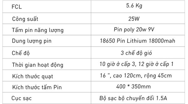 9. Công nghệ pin: Pin Lithium photphate có dung lượng lớn 24000MAH hệ số an toàn cao. Tuổi thọ pin có thể đạt đến hơn 8 năm. Hiệu quả sạc pin cao và không lo phát nổ ngay cả khi bị va chạm mạnh. Một phần rất quan trọng đáng để quan tâm đến khi lựa chọn quạt năng lượng mặt trời là PIN, quạt tích điện sử dụng lâu hay không phụ thuộc rất nhiều vào dung lượng mà tuổi thọ PIN.