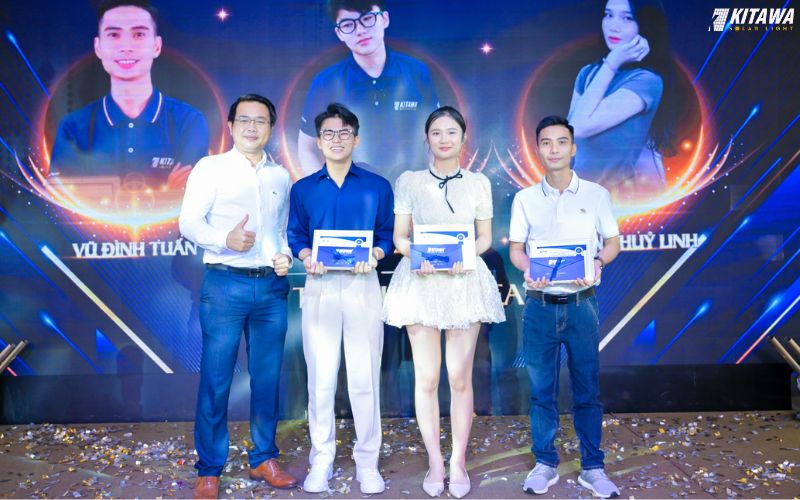 Một trong những khoảnh khắc được mong chờ nhất chính là phần vinh danh các cá nhân và tập thể xuất sắc năm 2025. Những gương mặt quen thuộc bước lên sân khấu trong tiếng cổ vũ nồng nhiệt của đồng nghiệp. Đây không chỉ là phần thưởng cho thành tích, mà còn là sự ghi nhận cho tinh thần trách nhiệm, sáng tạo và bền bỉ trong suốt một năm làm việc. Mỗi giải thưởng được trao đi là một câu chuyện, một hành trình vượt thử thách để góp phần đưa thương hiệu đèn năng lượng mặt trời KITAWA ngày càng vững mạnh.