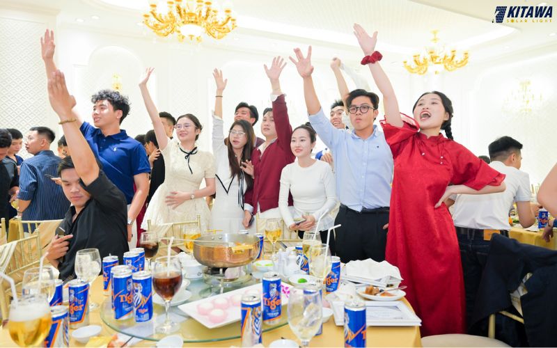 Ngay từ những giây phút đầu tiên, không khí buổi tiệc đã vô cùng sôi động. Khu vực sảnh tiệc nổi bật với hai gam màu xanh - trắng quen thuộc, gợi liên tưởng đến ánh sáng, nguồn năng lượng sạch và tinh thần phát triển bền vững mà KITAWA luôn theo đuổi. Trên màn hình, những hình ảnh các dự án đèn năng lượng mặt trời từ thành phố đến vùng quê lần lượt xuất hiện, như một lời khẳng định nhẹ nhàng nhưng đầy ý nghĩa: KITAWA không chỉ mang đến sản phẩm, mà còn đang góp phần thắp sáng cuộc sống ở khắp mọi nơi.